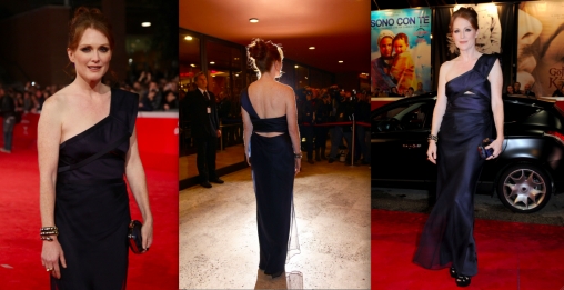 A atriz Julianne Moore arrasou no look no tapete vermelho, na noite de pré-estreia do filme “The Kids Are All Right”, em Roma, na Itália, nessa terça-feira (2).