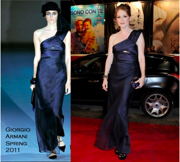 Uma das ruivas mais famosas de hollywood usou um vestido azul marinho um ombro só, do estilista Giorgio Armani, da coleção primavera 2011, com uma clucth Bottega Venetta e pulseira de cobra da marca Bulgari.