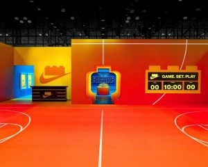 Batizado de “Playroom”, o ambiente reuniu quadra de basquete, blocos gigantes de LEGO e desafios interativos que convidavam os visitantes a arremessar, personalizar camisetas e criar experiências próprias dentro da instalação.