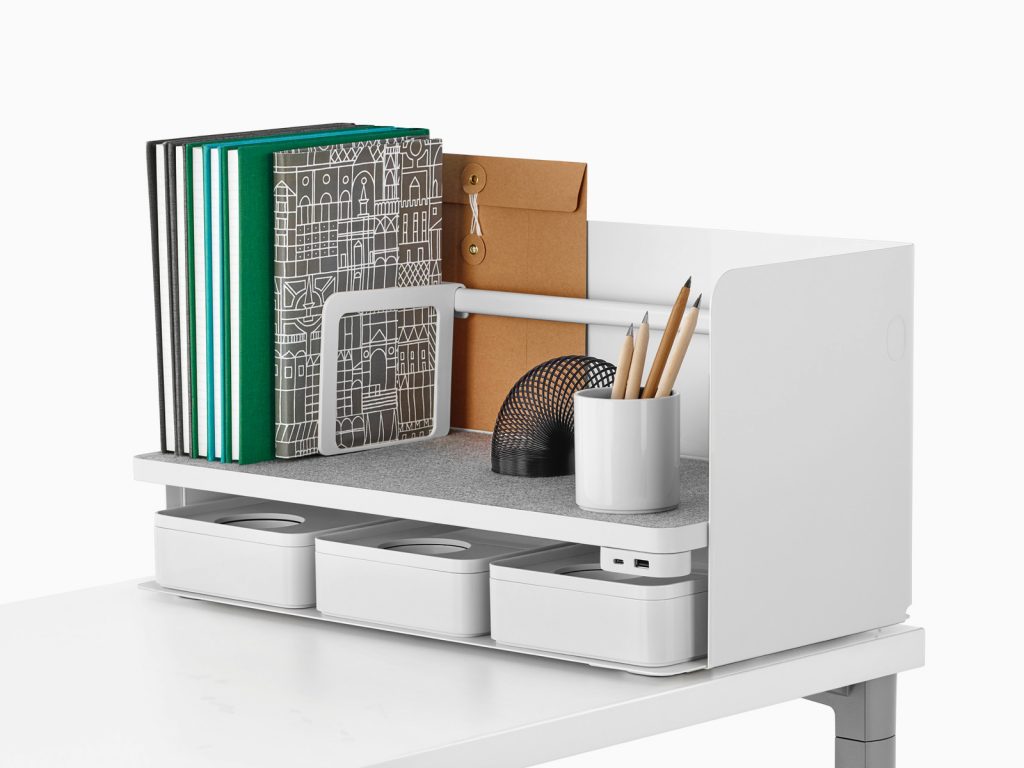 Para trabalho ágil, o produto possibilita um armazenamento que acompanha o fluxo. Desenhado por Sam Hecht e Kim Colin para Herman Miller, ele é projetado com flexibilidade e usos versáteis em mente. Este carrinho de escritório moderno oferece armazenamento pessoal em movimento em um perfil fino e minimalista.