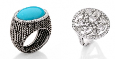 O anel de ouro negro com turquesa e diamantes brancos nos chamou a atenção. Moderno, pode ser usado tanto com um look mais despojado durante o dia ou mais arrumado para a noite.E se você quer um anel mais “imponente” separamos o de ouro branco com diamantes.